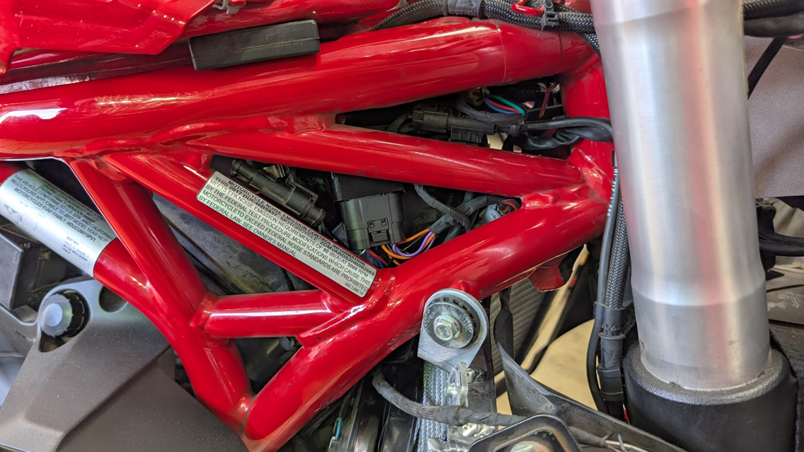 - Connect the diagnostic connector to the bike diagnostic port under seat near fuse box. Route cable under tank. Use the remaining zip ties to secure the cable to the frame. It is critical not to put this cable anywhere it could get pinched, rubbed, or caught in any moving parts.